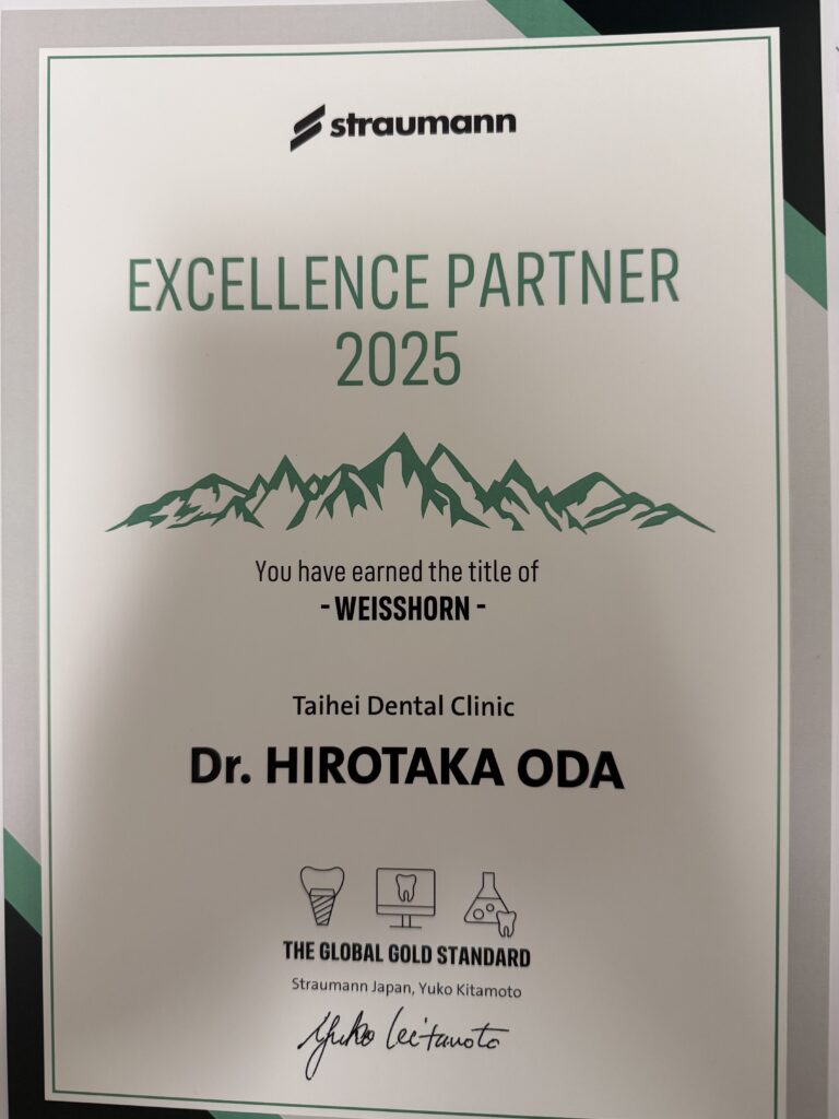 このたび当院は、世界的インプラントメーカーであるStraumann Group(ストローマン社)より、「EXCELLENCE PARTNER 2025」— WEISSHORN —の認定をいただきました。この認定は、2025年においてインプラント治療を通じて多くの患者様の口腔機能の回復に貢献した歯科医院に対して授与されるものです。